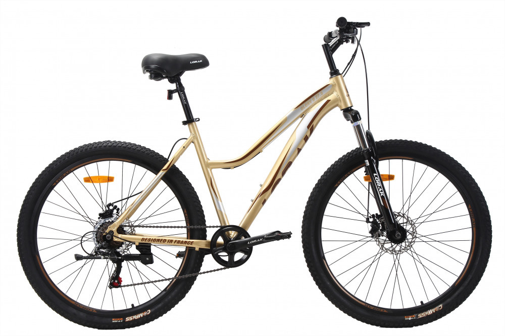 Цвет # Золотисто Серый Материал рамы # алюминий Тип тормозов # дисковый механический Диаметр колес # 27.5 Рама # 15" (на рост 141-160) Вилка # STEEL ход 80 мм, пружинно-эластомерная Количество скоростей # 7 Передний переключатель # - Задний переключатель # LTWOO A2 или Shimano TZ500 (зависит от партии) Передний тормоз # YinXIng или JAK-8 mech. disc 160 механический Задний тормоз # YinXIng или JAK-8 mech. disc 160 механический Манетки # LTWOO A2 триггер Shimano ST-EF-41 (зависит от партии) Шатуны # 1ск. 36Т 170MM алюминий Каретка # FP Feimin картридж Задние звезды # ATA 7 скоростей трещетка Втулки # сталь Shengfu подшипники насыпные или на промах (зависит от партии) Покрышки # Compas 27.5*2.0 Обода # двойной DA-18 Цепь # KMC C050 Руль # Lorak стальной 680W Вынос # Lorak стальной подъемный Подседельный штырь # Lorak 27.2*300MM Рулевая колонка # Neco резьбовая Седло # Lorak 6558 Педали # пластик FP Вес # 15,9 кг